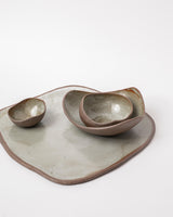 A flat hand built, vessel with organic raised edges. Finished with a textured muted grey interior with burnt earth glaze details around its edges. Beautiful as a standalone piece or as part of a stackable set featuring other Tracy Muirhead vessels. Due to the handmade nature of this item, variances may occur between pieces