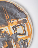 This plate features a study of the rooftops outside my studio window in Adealide CBD. This plate is wheelthrown, painted with iron oxide and reduction fired to 1300 degrees.