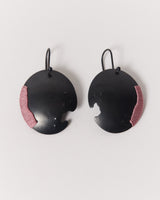 Sterling silver earrings, oxidised, with an organically shaped section removed from each edge. On the opposite side of each oval the edge is stitched in an irregular border of musk pink silk thread. The gently convex design includes a sparse, asymmetrical pattern of raised dots. The earrings hang from handmade sterling silver hooks. People who wear pink are usually up for some fun – just like our feathered friends the galah! These birds with their pink and grey feathers are found throughout the rangelands in Australia, and often near water. In Ngiyampaa language of the Pilaarrkiyalu people, the Traditional Custodians of country between Cobar and Ivanhoe in New South Wales, the galah is called ‘kilaa’. They move in flocks of 10-15 birds, but sometimes they converge in much greater numbers to collaborate. For example, they will start amassing along a wire suspended across a waterhole, calling to other galahs to join them so that their increasing weight gradually lowers the line towards the surface of the water. Only once a couple of birds have taken a sip, the entire flock will simultaneously fly off the wire, before a couple of birds return to begin the process all over again. Endless fun!