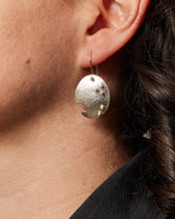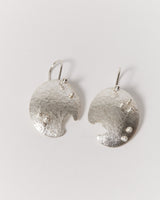 Silver earrings with beaded wire accents and an organically shaped section removed from each edge. The surface of each gently convex earring has been lightly hammered. The earrings hang from handmade sterling silver hooks. Let it rain! The mighty rangelands flourish even though it is an ecosystem that receives small amounts of rain compared to some coastal or rainforest environments. The hammered surface with beaded wire inserts combined create an effect like a rain shower falling across the surface of a puddle, dam, creek or river.