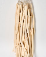In the necklace series 'A Brushing of Branches' 2024, bundles of small apple and apricot branches sanded to a silky smooth finish, appear suspended. Each hanging on a fine silver chain, the branches softly brush and tap against each other as the wearer moves.