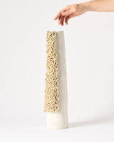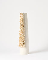 A decorative, wheel formed ceramic sculpture. Handmade raku additions are individually placed into the initial form creating a strip of abundant texture.