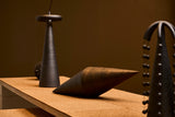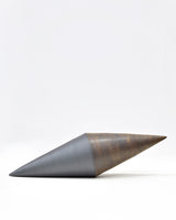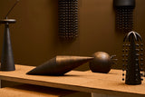 'Long Pod in Gold' is a simple geometric sculptural form comprised of two wheel thrown conical shapes which were joined before firing, then glazed in a black iron oxide and dark gold glaze. There is a slightly levelled section at the base to assure stability.