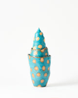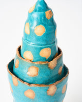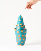 A spotted urn with lid. Using a green copper glaze. The primary form Elk uses in his ceramics is the funeral urn. This form reflects a journey through grief, navigating unfamiliar terrains toward an afterlife, and ultimately finding acceptance and celebration for a life well lived.
