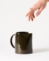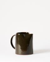 Wheel thrown stoneware mug in a deep forest brown glaze. Dishwasher safe.