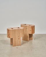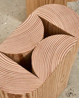 The Arc table embodies Goodrum's love for pure geometry, reconfiguring a half circle, balancing positive and negative elements with unconventional proportions. The form repeats across the table or stool and the stretched bench, giving the collection a quietly rhythmic presence.Crafted from recycled solid Oregon timber, the end grain exposes the tree's age through its rings, telling a story of seasons past.