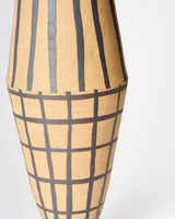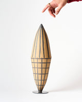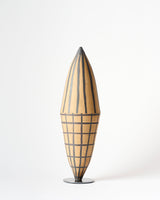 Video, 2024 is an original, one of a kind sculptural artwork. The piece stands on a narrow end supported by a steel rod fixed to a minimal steel base. The piece was made using wheel throwing and hand building techniques and decorated with a series of hand