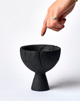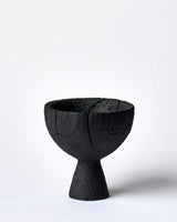 Ryujin carefully turns the wood on a lathe to create high-sided bowls, urns and platters based on the forms of sacred Japanese temple vessels. During the long air drying process, the forms begin to shift as the green wood loses moisture. The final dramatic transformation takes place as the timber chars and splits during the unpredictable burning process.