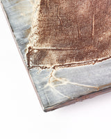 What remains after metamorphosis? Like a shell or skin, the porcelain surface stretches and holds what once lived beneath. The gauze membrane traces this act of release — a quiet echo of what remains after emergence.