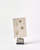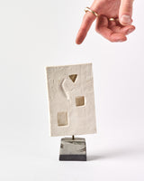 Abstract double-sided sculpture with a stand. Porcelain slabs hold quiet apertures — spaces where light seeps through restraint. Each window becomes a gentle threshold, revealing presence through absence, and stillness through translucence. Best positioned in a windowsill or in front of a lamp to show the translucent veil. Fragile to touch.