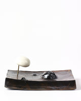 Material: Black Clay with oxide glaze and oxide wash. A porcelain gloss glazed spheroid with oxide splatters mounted to the slab with a brass rod. Oxidation Firing.