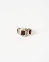 A sterling silver ring with three emerald cut garnets. One stone measuring 8x6mm and two stones measuring 6x4mm.