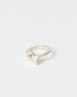 The Affinity Ring features a cluster of colourful brilliant cut sapphires set into the face of a freeform silver shape. It is contrasted with a hand engraved square band.