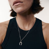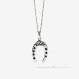 Suspended from our signature chain, an oversized charm in meticulous replication of the lucky horseshoe - an iconic symbol from renowned Sydney-based artist, Nell. Inset with Black Diamonds. For town or country.Hung from a 50cn chain. Get LUCKY every day.