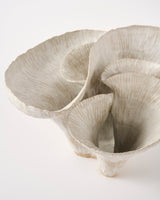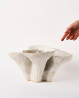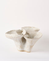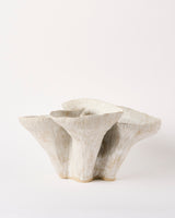 Using both stoneware and porcelain clay bodies, Kohl's vessels vary in tone from earthy buffs to bright whites. Thinly carved clay surfaces lay beneath a white dolomite glaze, it’s matte white and grey hues shimmer with small diopside crystals. Rippled walls fold inward and outward, opening to the viewer in unexpected ways, evoking notions of life’s ephemerality and interconnectedness.