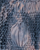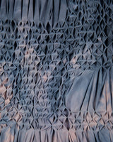Through the replication of housework in my process and the use of labour-intensive techniques, such as smocking, this body of work quietly demonstrates visible and invisible labour that takes place in both methods of artmaking, and inside domestic settings. Second hand textiles evoke a familiarity of moments past, responding to unknown memories, bodies and people unique to each material’s history. Here, expanded painting and craft practices collide, seeking to reveal the intimacies and complexities of these personal textile materials.” – Hannah Hall