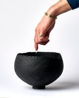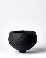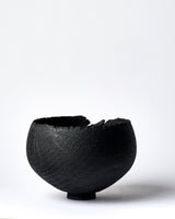 Ryujin carefully turns the wood on a lathe to create high-sided bowls, urns and platters based on the forms of sacred Japanese temple vessels. During the long air drying process, the forms begin to shift as the green wood loses moisture. The final dramatic transformation takes place as the timber chars and splits during the unpredictable burning process.