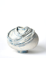 This hand-built porcelain moon jar features a fractured, expressive surface-the surface has been polished and brushed with a cobalt oxide wash. Inspired by both classical drapery and archaeological remnants, the piece embraces imperfection and rawness-surface cracks are highlighted rather than hidden, becoming part of the visual language. The form holds the tension between elegance and erosion, suggesting something unearthed or remembered. Watertight and easy to clean with warm water.