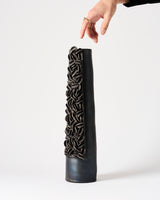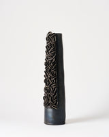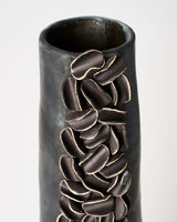 A decorative, wheel formed ceramic sculpture. Handmade raku additions are individually placed into the initial form creating a strip of abundant texture.