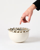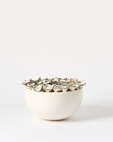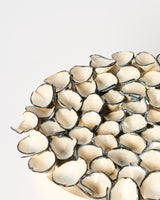 A decorative, wheel thrown ceramic piece. Finished with delicate paper clay additions reflective of fine oyster shells.