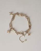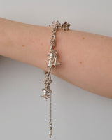 This bracelet features fused and tangled tubular links with smaller lengths of chains woven through. Attached to the bracelet are three small flowers and a single freshwater pearl.