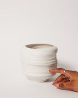 The Free-Form series presents a freely thrown sculptural vessel form that takes on its own life as it is being created. In particular a fluidity is apparent in these works, as each work depicts some of the attributes of the malleable nature of clay. The vessels may also be reminiscent of natural forms such as sea shells and other matter. However, the works may conjure other responses for the viewer. The dry matt glaze on these forms is delicate. The vessel should be washed by hand in warm soapy water and rinsed. Dry with a soft cloth.