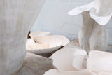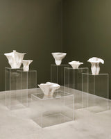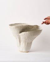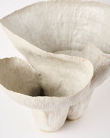 Using both stoneware and porcelain clay bodies, Kohl's vessels vary in tone from earthy buffs to bright whites. Thinly carved clay surfaces lay beneath a white dolomite glaze, it’s matte white and grey hues shimmer with small diopside crystals. Rippled walls fold inward and outward, opening to the viewer in unexpected ways, evoking notions of life’s ephemerality and interconnectedness.