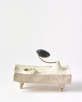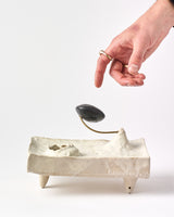 Material: Black Clay with oxide glaze and oxide wash. A porcelain gloss glazed spheroid with oxide splatters mounted to the slab with a brass rod. Oxidation Firing.