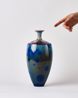 A striking wheel thrown vase with cobalt and copper crystalline glaze.