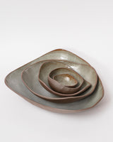A flat hand built, vessel with organic raised edges. Finished with a textured muted grey interior with burnt earth glaze details around its edges. Beautiful as a standalone piece or as part of a stackable set featuring other Tracy Muirhead vessels. Due to the handmade nature of this item, variances may occur between pieces