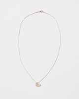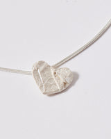 Crumpled paper-like texture, in the shape of a heart. Bleached silver finish on the pendant.